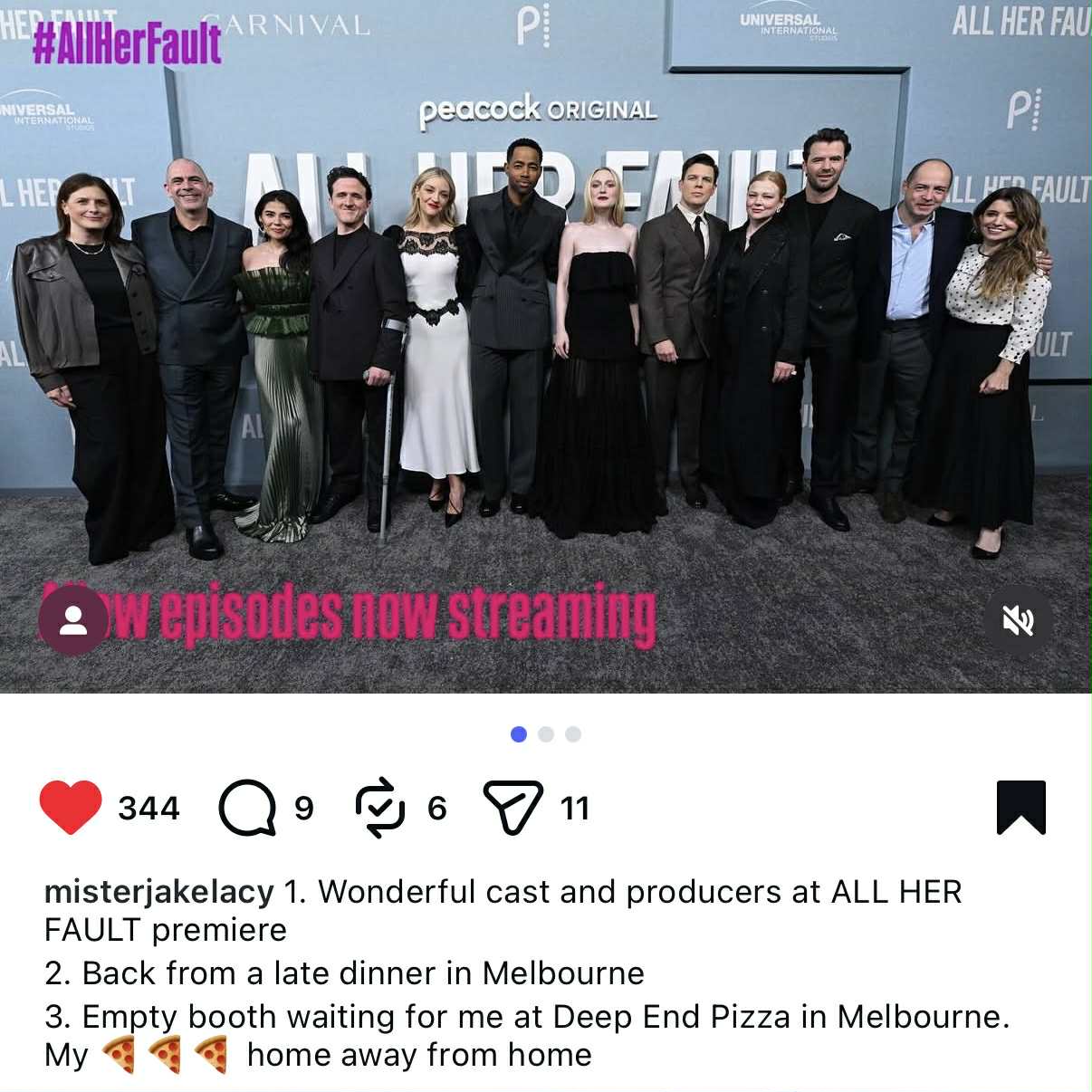 The entire cast of All Her Fault—this massive Peacock series they were filming in Melbourne—just casually showed up for dinner.