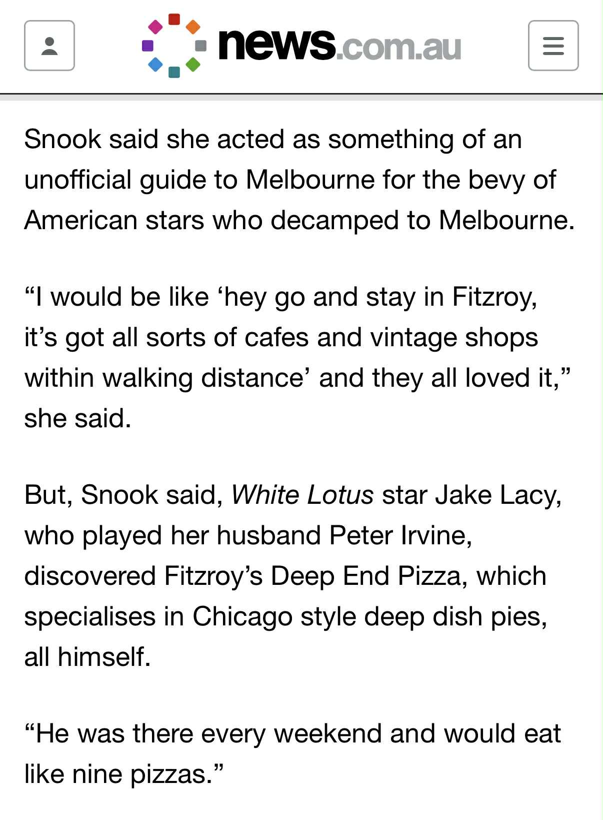 Sarah Snook to news.com.au: When talking about Jake discovering Deep End Pizza on his own: "He was there every weekend and would eat like nine pizzas."
