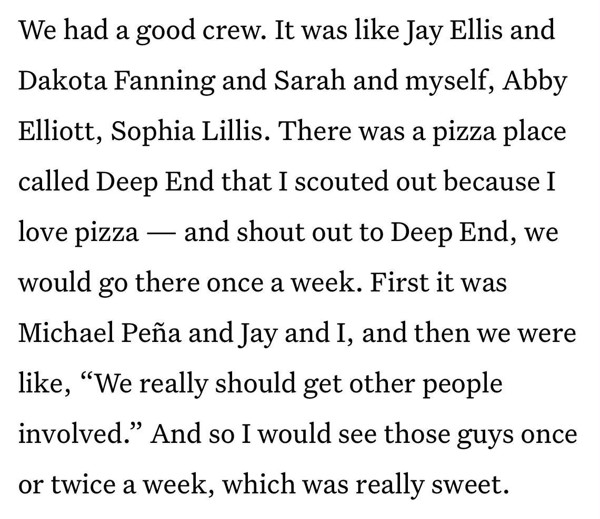 Jake Lacy to Bustle Magazine: "There was a pizza place called Deep End that I scouted out because I love pizza — and shout out to Deep End, we would go there once a week. First it was Michael Peña and Jay and I, and then we were like, 'We really should get other people involved.'"